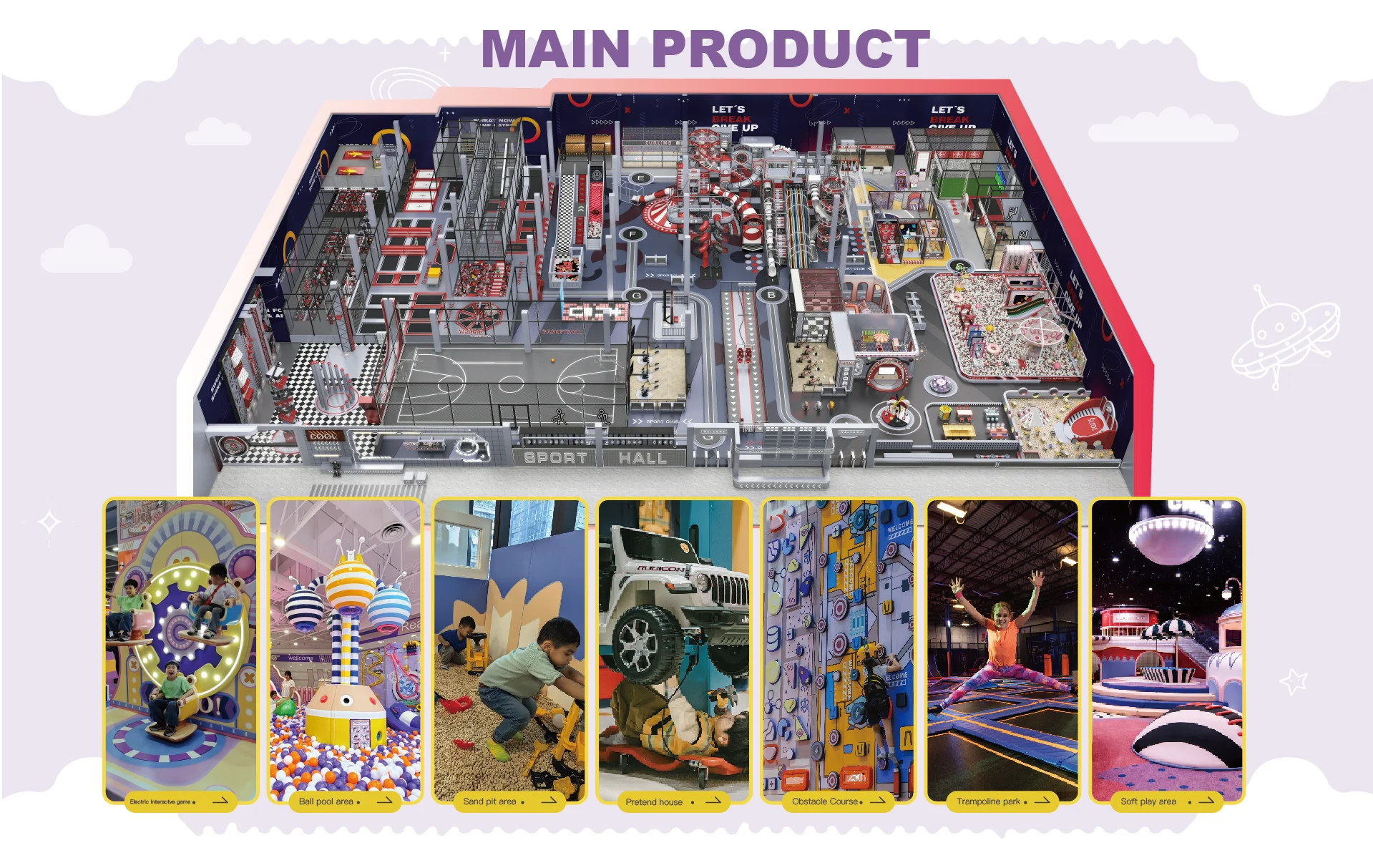 Productos principales:Parque infantil interior, Parque de trampolín, Muro de escalada, Módulos eléctricos de juego suave, Cursos de ninja